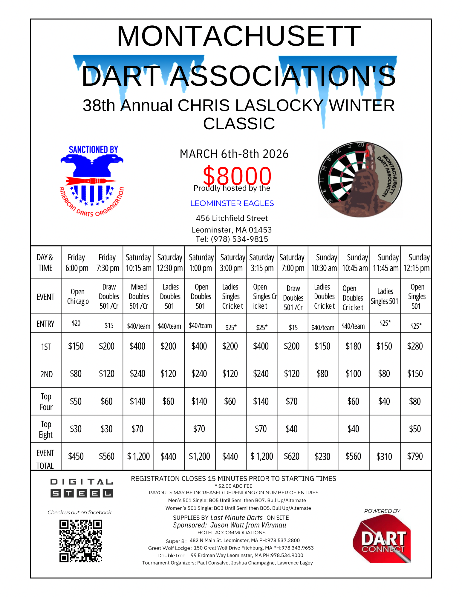 | Sanctioning Status: ✅ Approved! Date: 2026-03-06 thru 2026-03-08 Boards: 16 Address: 456 Litchfield Street City: Leominster, MA 01453 Region: 5-1 Host Affiliation: MTCHU - Montachusett Dart Association Contact 1: PAUL CONSALVO Phone 1: 508-843-7324 Email 1: click here to email Notes: Flyer needs approval 9/18/25 WDF Ranked Event: not WDF ranked | ![]() | |