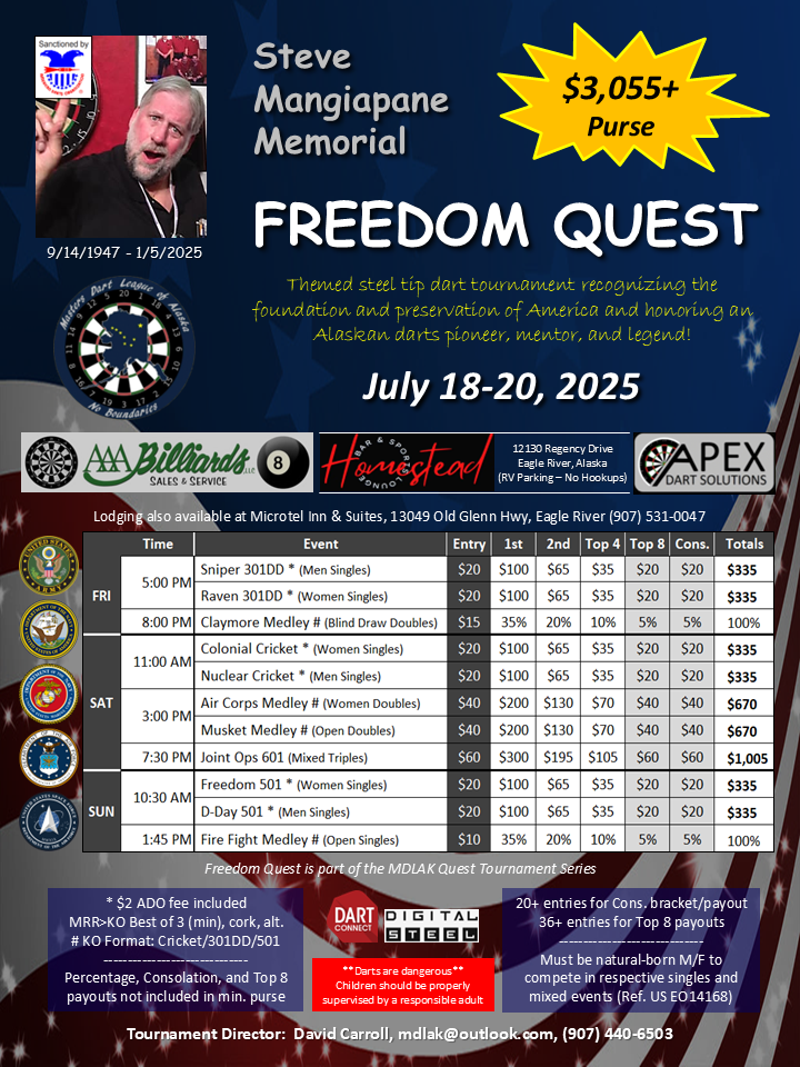 Sanctioning Status: ✅ Approved! Date: 2025-07-18 thru 2025-07-20 Boards: 22 Address: 12130 Regency Dr. City: Eagle River, AK 99577 Region: 1-1 Host Affiliation: MDLAK - Masters Dart League of Alaska Contact 1: David Carroll Phone 1: 907-440-6503 Email 1: click here to email WDF Ranked Event: not WDF ranked | ![]() |