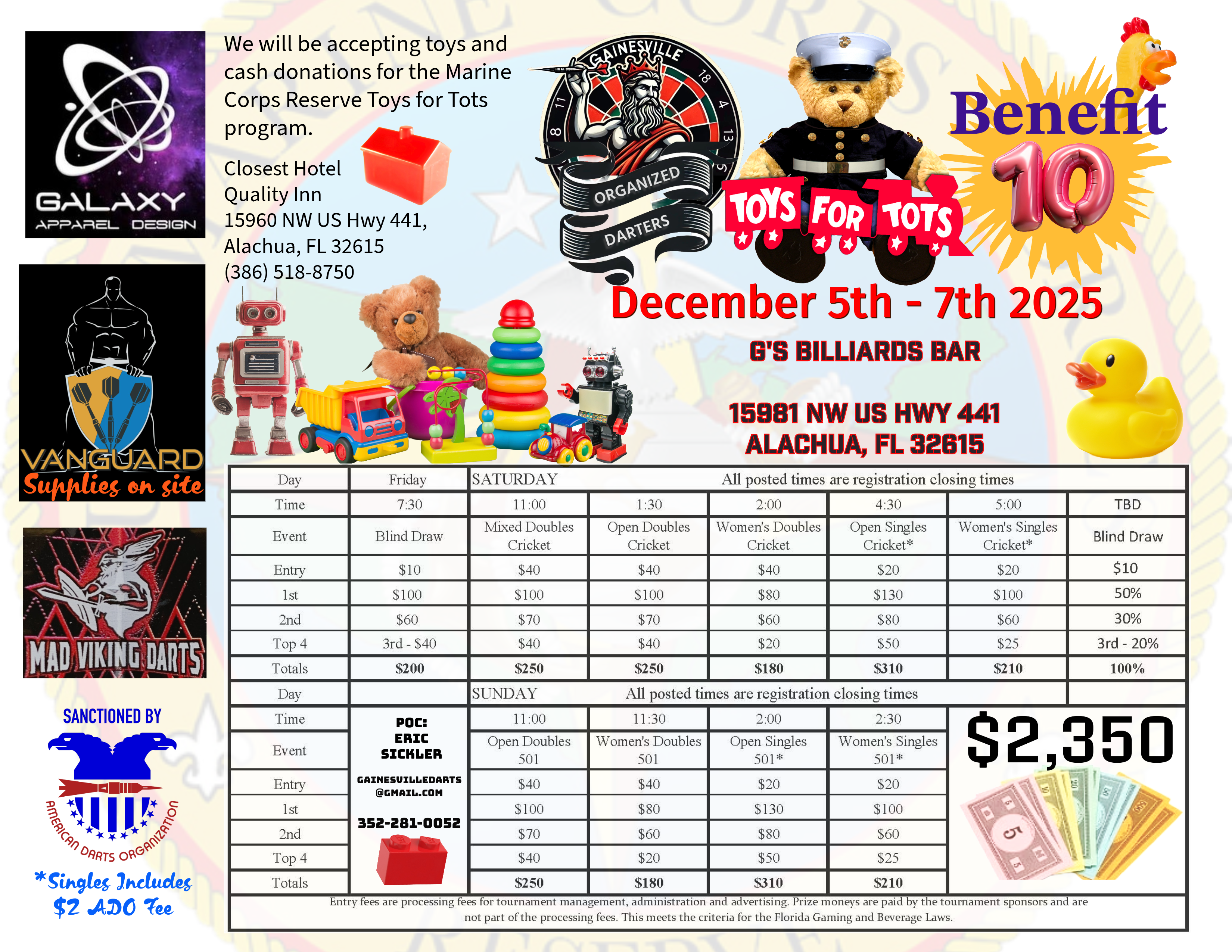 Sanctioning Status: ✅ Approved! Date: 2025-12-05 thru 2025-12-07 Boards: 10 Address: 15981 NW US HWY 441 Ave City: Alachua, FL 32615 Region: 4-5 Host Affiliation: GAIN - Gainesville Organized Darters Contact 1: Eric Sickler Phone 1: 352-281-0052 Email 1: click here to email WDF Ranked Event: not WDF ranked | ![]() |