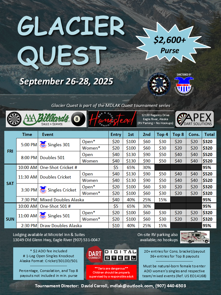 Sanctioning Status: ✅ Approved! Date: 2025-09-26 thru 2025-09-28 Boards: 22 Address: 12130 Regency Dr. City: Eagle River, AK 99577 Region: 1-1 Host Affiliation: MDLAK - Masters Dart League of Alaska Contact 1: David Carroll Phone 1: 907-440-6503 Email 1: click here to email WDF Ranked Event: not WDF ranked | ![]() |