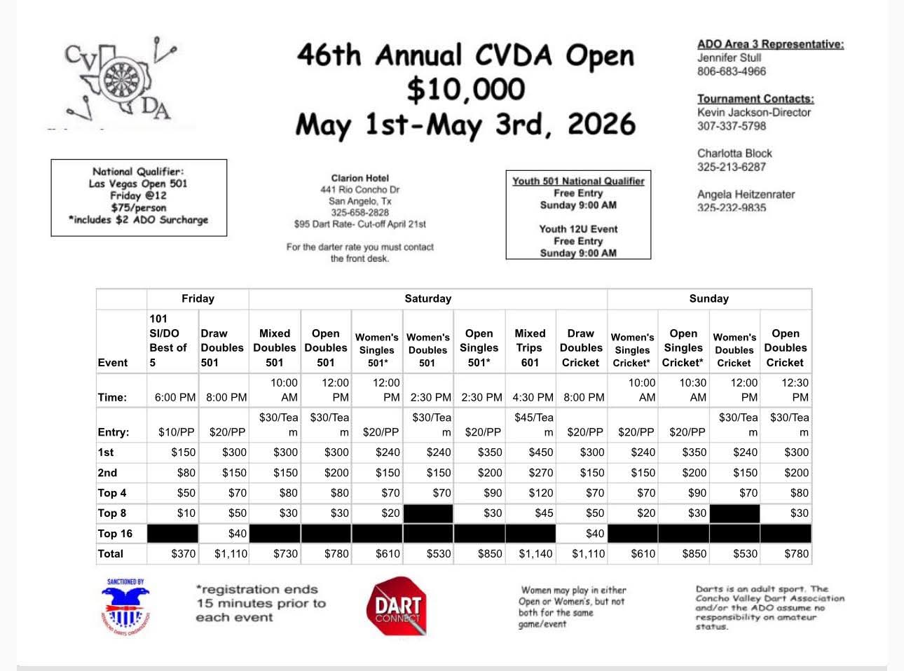 | Sanctioning Status: ✅ Approved! Date: 2026-05-01 thru 2026-05-03 Boards: 20 Address: 441 Rio Concho Drive City: San Angelo, TX 76903 Region: 3-5 Host Affiliation: CNCHO - Concho Valley Dart Association Contact 1: Angela Heitzenrater Phone 1: (325) 232-9835 Email 1: click here to email WDF Ranked Event: not WDF ranked | ![]() | |